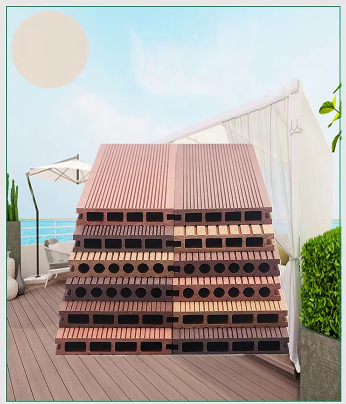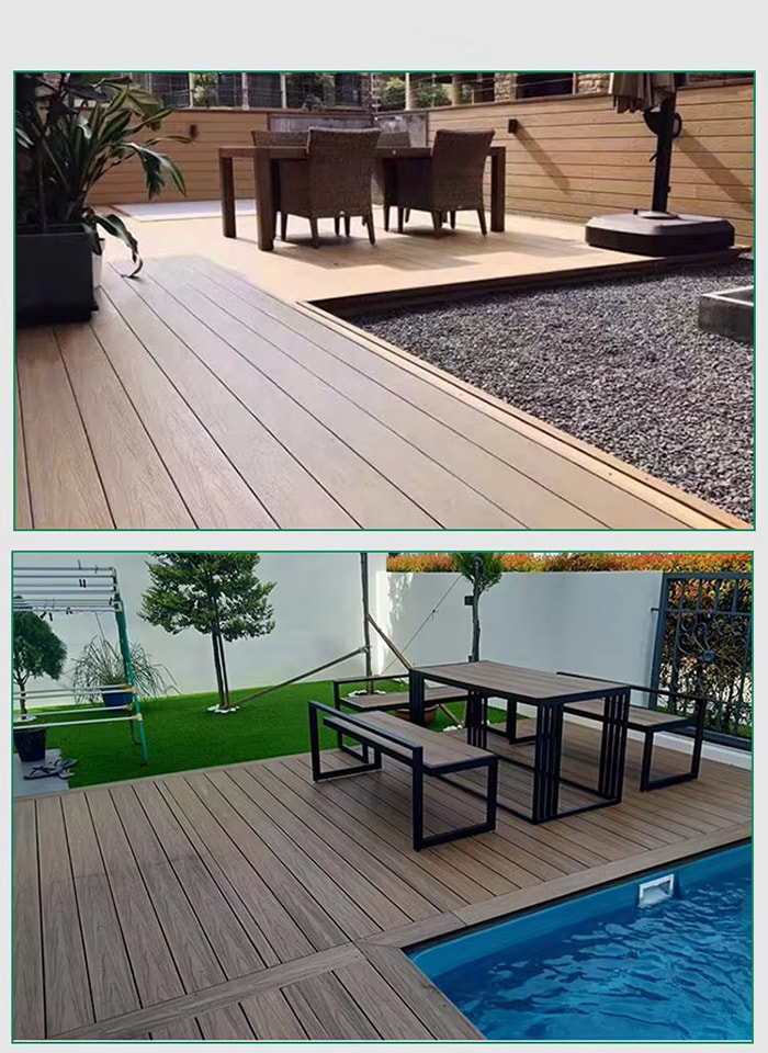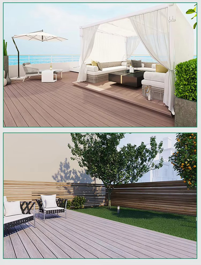 Piso WPC (Wood Plastic Composite) é um novo tipo de piso ecologicamente correto feito de fibra de madeira ou fibra de bambu como matéria-prima principal, composto com resina de PVC, retardador de chama, etc. Sua estrutura é dividida em quatro camadas: camada resistente ao desgaste (revestimento UV), camada decorativa de grão de madeira/grão de pedra, camada de material de base reforçada com fibra e camada silenciosa. Tem a textura da madeira real e o desempenho à prova d'água e à prova de umidade do plástico e é adequado para decoração de pisos internos e externos.