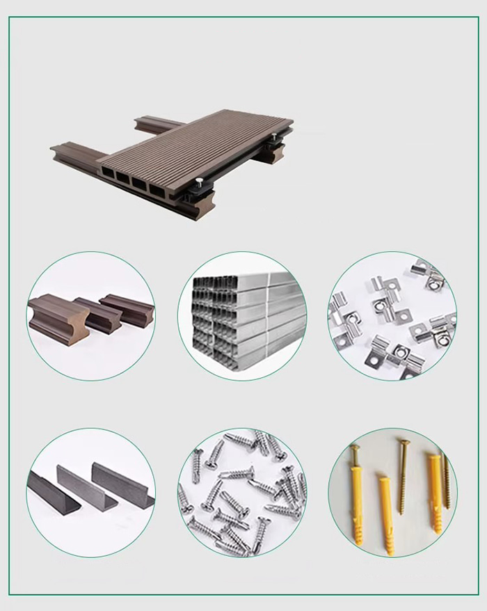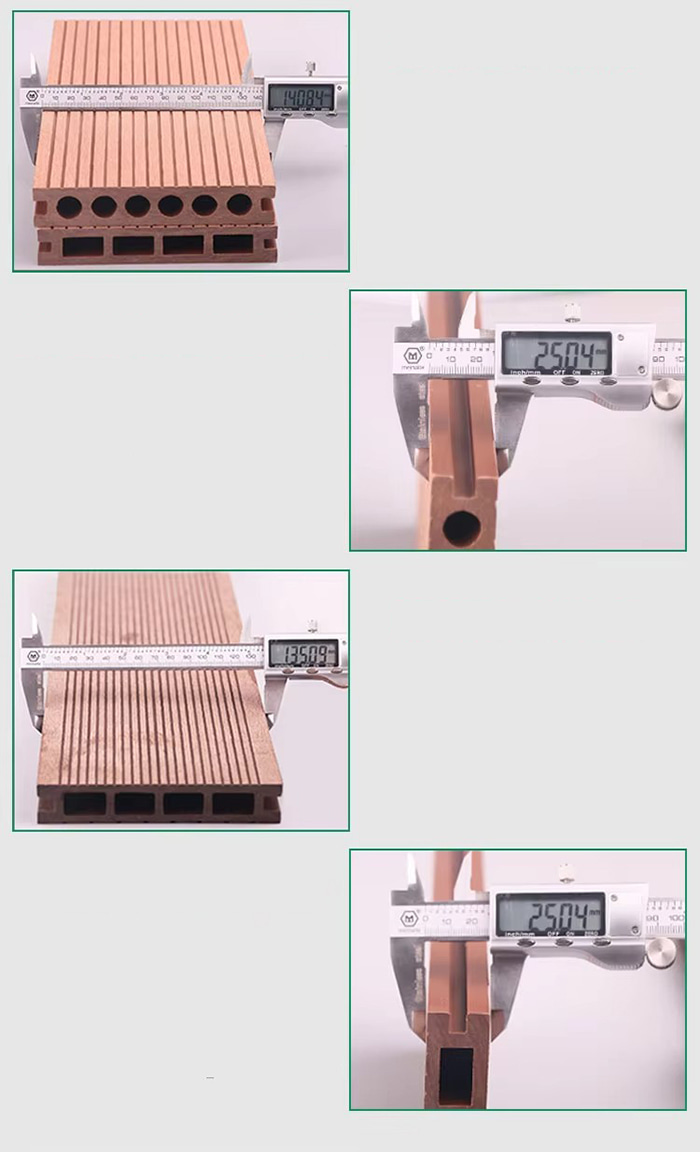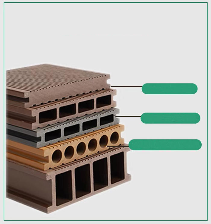 Mistura de substrato Fibra de madeira (50-60%) Resina de PVC (30-40%) Camada anticorrosiva de fibra de carbono (5-10%), adicionando retardador de chama de hidróxido de alumínio para melhorar para o grau A2.
