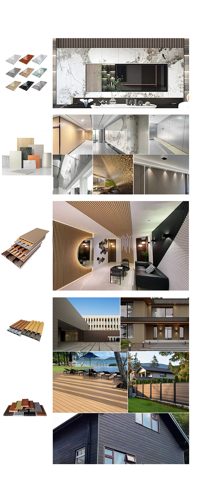 Decoração residencial: Pode ser usada para decoração de paredes em salas, quartos, cozinhas, banheiros, varandas, etc. Pode imitar a textura de materiais naturais como grãos de madeira e grãos de pedra, adicionar beleza natural e fornecer isolamento acústico.