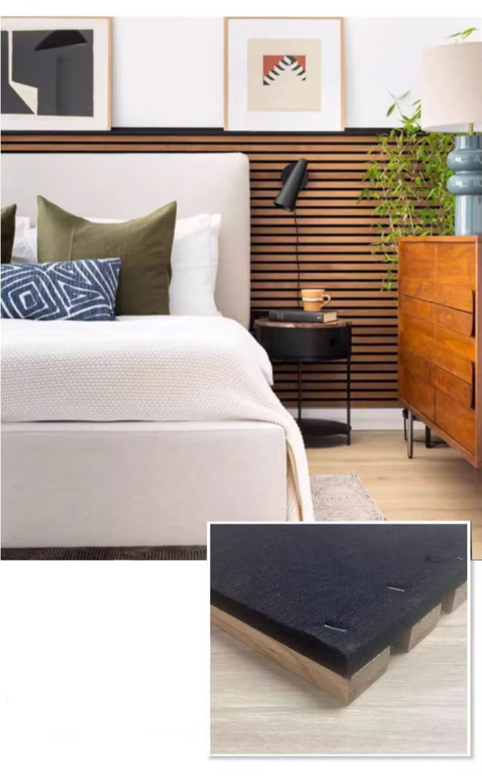 Camada porosa: Fibra de madeira e algodão absorvente de som são compostos, com porosidade de ≥30% e distribuição de tamanho de poro de 0,5-2mm para otimizar a absorção de ondas sonoras.